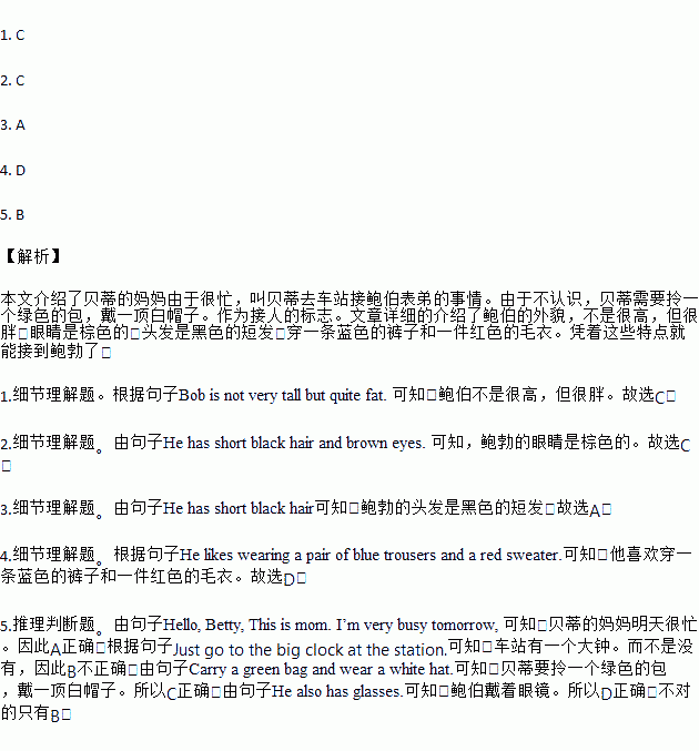 “Hello, Betty, This is mom. I’m very busy tomorrow, so can you please help me meet your cousin Bob at the bus station at nine o’clock tomorrow morning? I’m afraid you don’t know him. Just go to the big clock at the station. Carry a green bag and wear a white hat. Bob is not very tall but quite fat. He has short black hair and brown eyes. He also has glasses. He likes wearing a pair of blue trousers and a red sweater. Can you find him?”