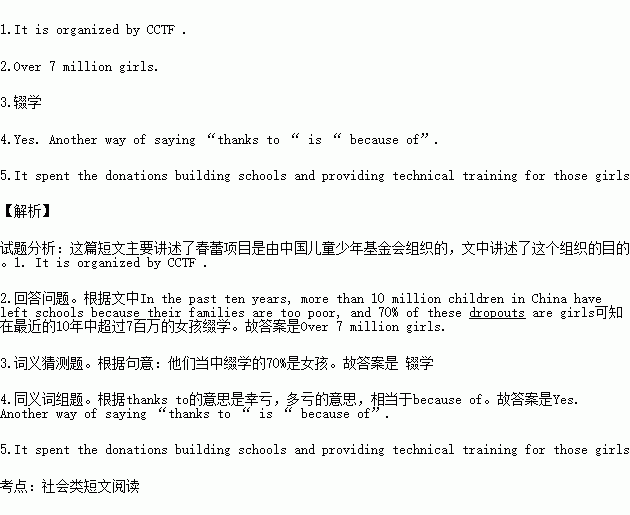 The Spring Bud Project was organized by the China Children and Teenagers’ Fund(CCTF), under the leadership( 领导) of the All China Women’s Federation(联合会). The fund was started by Madam Zhou Jiebing, who donated 1 million Hong Kong dollars.
