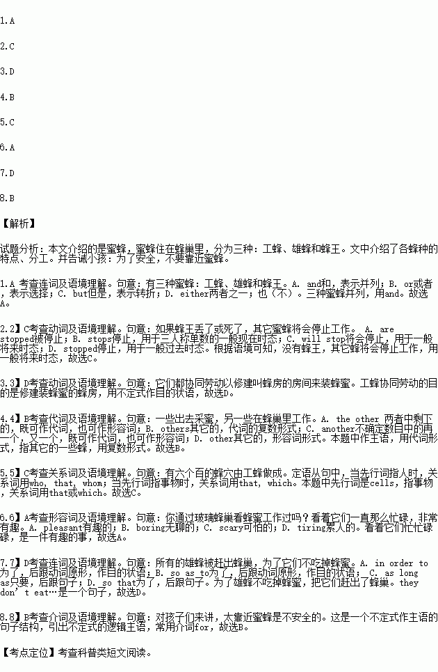 Bees live in a house that is called a hive. There are three kinds of bees: workers, drones (雄蜂) queens. Only one queen bee can live in each hive. If she is lost or dead, the other bees their work.