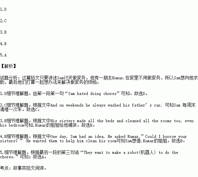 Sam had a foreign friend at school. His name was Kumar. Doing chores in Kumar’s family was very different. In the house only the girls did chores. His sisters made all the beds and cleaned all the rooms too, even his bedroom.His mother always cooked the meals, and his sisters helped her to go shopping, and prepare the food. They worked hard at home,doing all the chores with their mother. So when Kumar talked to his friend Sam about chores, he felt very lucky. One day, Sam had an idea. He asked Kumar,”Could I borrow your sisters? ” He wanted them to help him clean his room,but they said “ no ” Instead, they asked Sam to teach their brother how to do chores, so he could make his own bed.