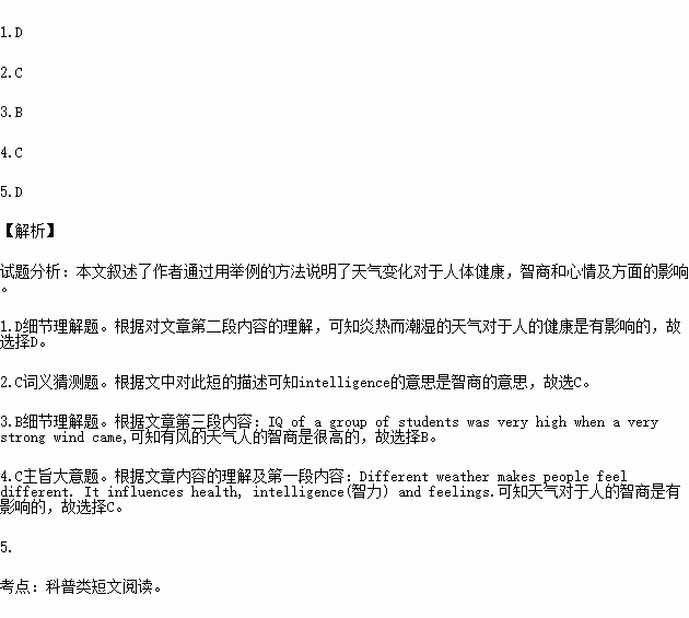 Different weather makes people feel different. It influences health, intelligence and feelings. In August, it is very hot and wet in the southern part of the United States. People there have heart trouble and other kinds of health problems during this month. In the Northwest and the Middle West, it is very hot at some times and very cold at other times. People in these states have some heart trouble after the weather changes in February or March.