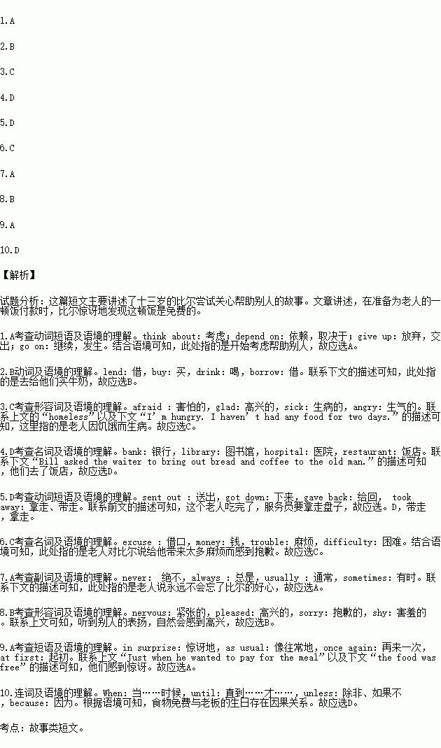 Bill was when he heard this. Just when he wanted to pay for the meal, the waiter came. Bill and the old man learned that the food was free it was the birthday of the boss, and they were the first customers(顾客)that day.