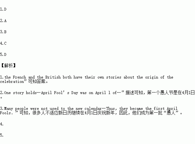 One story holds that the first April Fool’s Day was on April 1 of the year when the king of France introduced the new calendar.This new system placed the day that had formerly been the first day of a new year on April l.Many people were not used to the new calendar and continued(继续)to celebrate New Year’s Day on what had become the first day of April.Thus,they became the first April Fools.Others began to give funny gifts on the day to laugh at the fools who continued to celebrate the New Year on April 1.