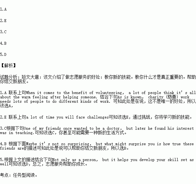 When it comes to the benefit of volunteering, a lot of people think it’s all about the warm feeling after helping someone. 1._________. As is known, charity (慈善) work needs lots of people to do different kinds of work. It means that there are many surprising benefits for volunteers.