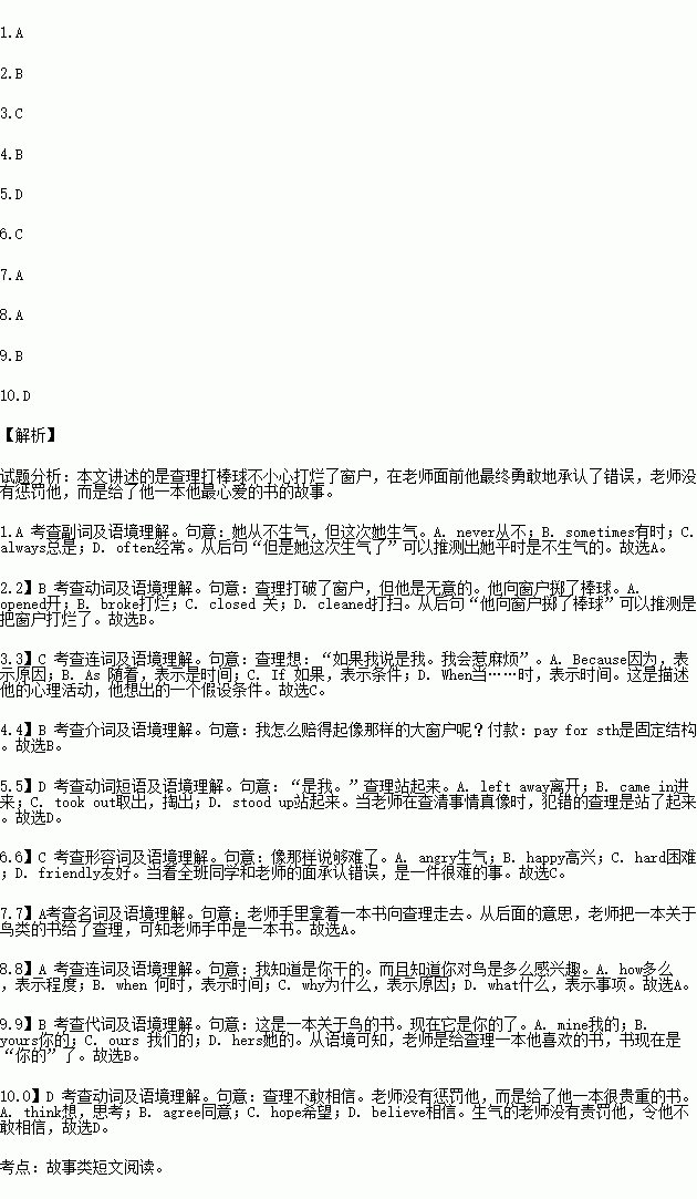 “I know you did it, and I know interested you are in birds,” she said. “Here’s a book about birds. It’s now. I won’t punish (惩罚) you. But remember, it’s only for your honesty (诚实).”