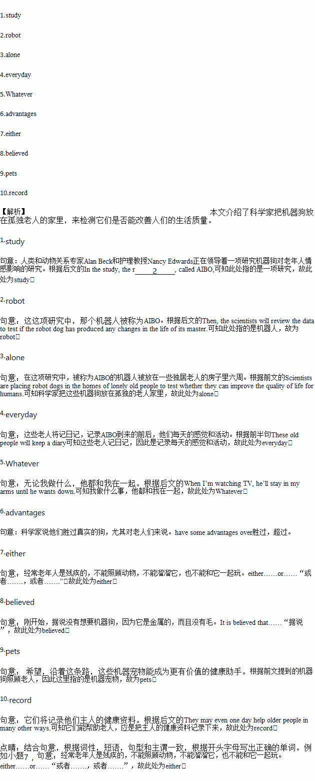 In the study, the r2., called AIBO, is placed for six weeks in the houses of some old people who live a3.. Before placing AIBO in the home, scientists will collect baseline data (数据) for six weeks. These old people will keep a diary to note their e4.feelings and activity before and after AIBO. Then, the scientists will review the data to test if the robot dog has produced any changes in the life of its master.
