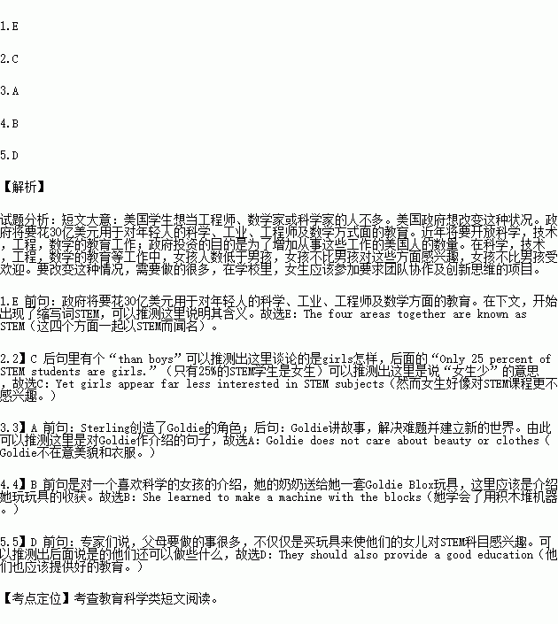 A. Goldie does not care about beauty or clothes B. She learned to make a machine with the blocks(积木) C. Yet girls appear far less interested in STEM subjects D. They should also provide a good education E. The four areas together are known as STEM |