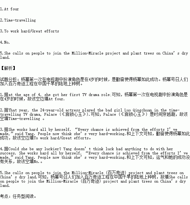 In May, Yang became the ambassador (大使) for the Climate Group to fight the bad weather. She calls on people to join the Million-Miracle (百万奇迹) project and plant trees on China’s dry land.