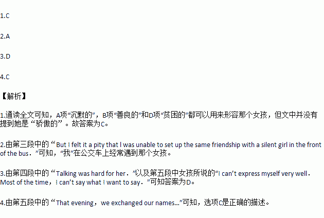 But I felt it a pity that I was unable to set up the same friendship with a silent girl in the front of the bus.Her old clothing suggested that she didn’t have much money,but she always took a cup of water for the driver.I guessed she was a kind girl.But why did she sit in silence instead of talking with us?Why did she never reply to our friendly greetings?Couldn’t she smile?