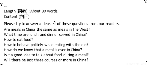 同学们,在刚才的阅读中我们了解到一些有关西方饮食文化的有趣知识。现在某国外旅游杂志向你约稿,请你以 When in China, do as the Chinese do!为题写一篇文章,向西方读者介绍我们中国的饮食文化。以下是此杂志社发来的稿件要求,请仔细阅读,完成写作。