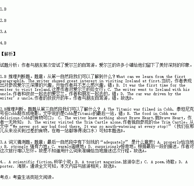 We stayed in a castle in Dublin for two days, where my ancestors(祖先) came from. The town we thought we might be bored in was Kilkenny, but we loved every minute we were there. There were so many places to explore and the pictures we took were beautiful.