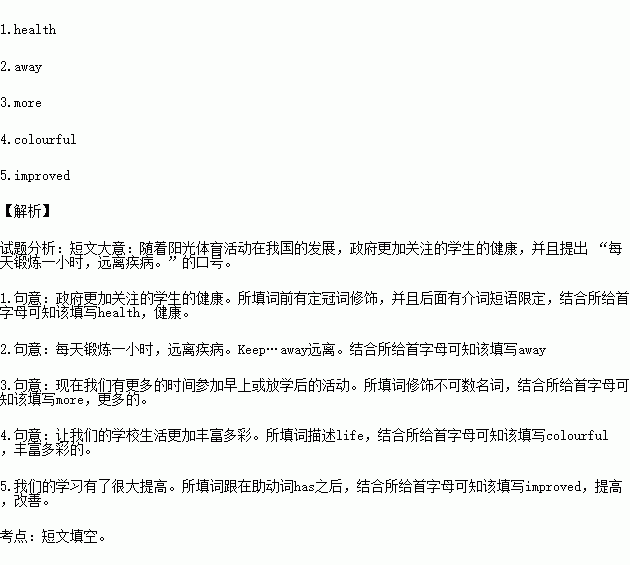 As the event of Sunny Sports develops in our country, the government has paid more attention to the1.h of the students and raised,“Exercise one hour a day, keep illness2.a .”So far our school life has changed a lot. Now we have3.m time to take part in the morning or after school activities. We play football, basketball and swim. They let our brains relax and make our school life more4.c . We have become more energetic. Above all our study has 5.i greatly. Let’s take exercise every day. It can build up our body strength and reduce diseases.