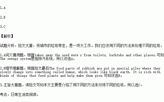 In some cities the rubbish is collected and taken outside of city to a dump.Often the city dump is placed where the ground is low or there is a big hole.The kitchen rubbish is broken into small pieces and sent into the sewage system.The sewage system takes away the used water from toilets, bathtubs and other places.
