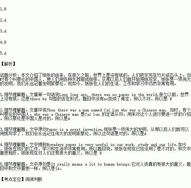 Long long ago, there was no paper in the world. People had to write characters(汉字) in bamboo slips or stones.Then there was a man named Cai Lun who was a Chinese man. He made people use all kinds of things to invent paper. From then on, people can use paper to write on. Paper is a great invention. We always remember the great inventor Cai Lun. Nowadays paper is very useful in our work, study and our life. It really means a lot to human beings.