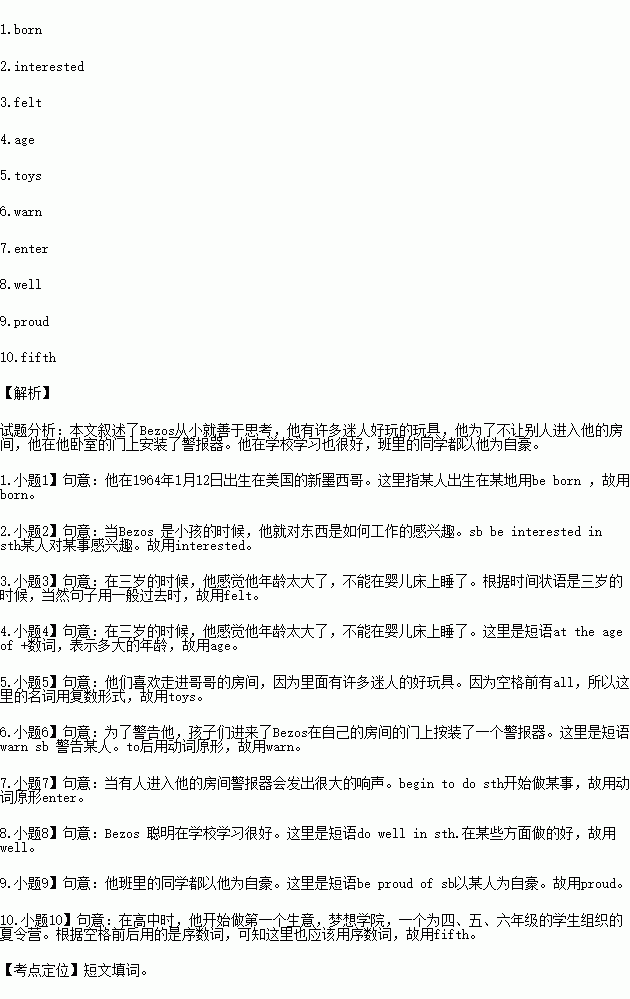 Jeff Bezos is the founder and CEO of Amazon. com. He was 1. (出生)on January 12,1964,in New Mexico,U.S. As a child,Bezos was very 2. (感兴趣的)in how things worked. From the time he learned to walls,Jeff was busy trying to change his world. He 3. (感觉)he was too old to sleep in a baby bed at the 4. (年龄)of three,so he found a tool and took the bed apart. Instead of getting mad,his family encouraged him. Bezos had a younger sister and brother. They loved going into their brother's room because of all the fascinating 5. (玩具)when they learned 'to walk.To 6. (警告)him that the children were coming,Bezos fixed an alarm to his bedroom door that made a loud sound when someone began to 7. (进入)his room.