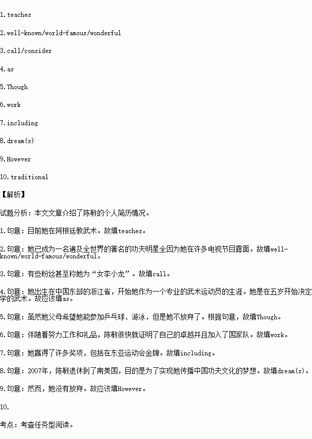 Chen has practiced kung fu for 25 years. She t 1. the martial art (武术) in Argentina at present. She has become a w 2. kung fu star all over the world because of her appearances in many TV shows. Some fans even c 3. her the "female Bruce Lee."