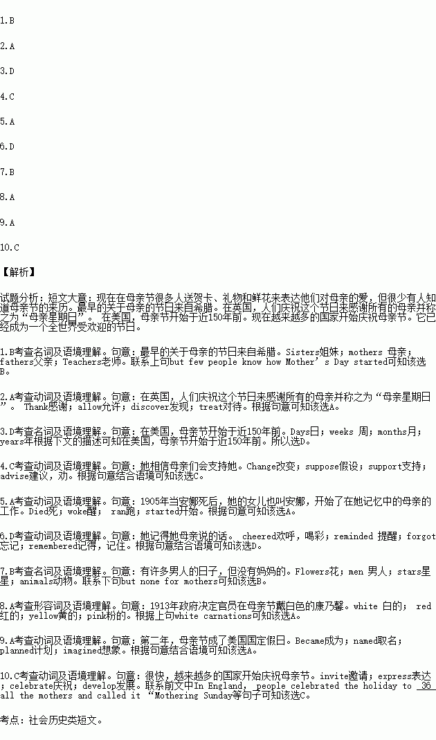 Today, many people send cards, presents and flowers on Mother’s Day to show their love, but few people know how Mother’s Day started. The earliest festival for _ _ was from Greece. Christians (基督教徒) celebrated this festival on the fourth Sunday. In England, people celebrated the holiday to _ _ all the mothers and called it “Mothering Sunday”.