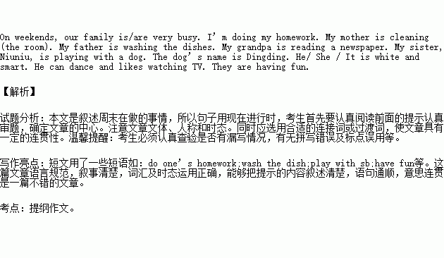 请根据以下提示写一篇60词左右的小短文:周末,我家人都很忙。我在做作业,妈妈在打扫房间,爸爸在洗餐具,爷爷在看报纸,妹妹妞妞在和小狗玩。小狗叫丁丁,白色,很聪明,会跳舞,还喜欢看电视,她们玩得很开心。