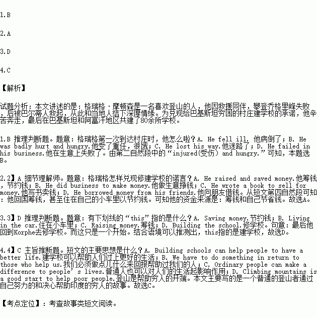 Greg’s story began with failure. In 1993, he set out to climb K2, the world’s second highest mountain. But Greg never made it to the top. After five days, he stumbled(踉跄)into the village of Korphe in northern Pakistan, injured(受伤)and hungry. The kind villagers there looked after him for several days.