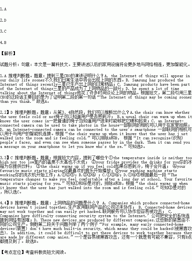 So, how do household(家用)objects that are part of Internet of things work? Well, think of a usual chair. When connected to the Internet, the chair warms up when it knows that the user has just walked into the room and is feeling cold.