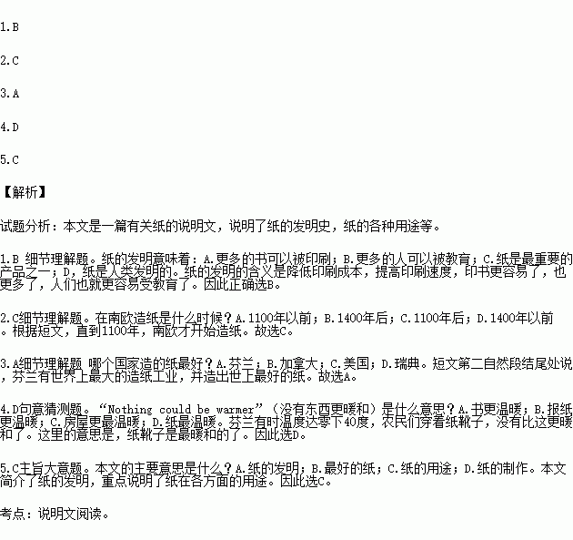 Paper is very good for keeping you warm, Houses are often insulated(隔热)with paper. You have perhaps seen homeless men sleep on a large number of newspapers. They are insulating themselves from the cold. In Finland, in winter it is sometimes 40 degrees below zero. The farmers wear paper boots in the snow. Nothing could be warmer.