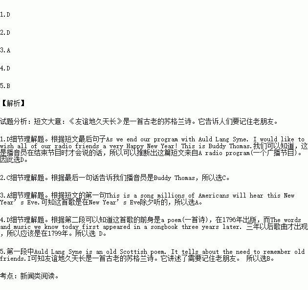 The song is played in the United States mainly on New Year’s Eve. The version (译文) you are hearing today is by the Washington Saxophone Quartet. As we end our program with Auld Lang Syne. I would like to wish all of our radio friends a very Happy New Year! This is Buddy Thomas.