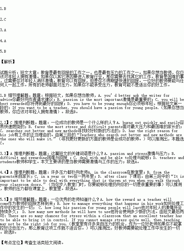 Teaching is one of the most rewarding(有回报的) jobs. It is also one of the most stressful. If you want to be a teacher, you should have a passion(激情) for young people. If you are thinking about going into teaching for any other reason than this, you need to find another job.
