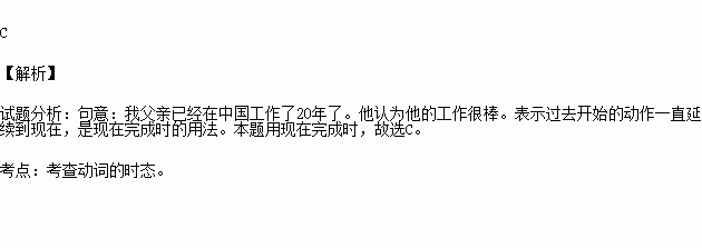 My father ______ in China for 20 years already. He thinks his job is great.