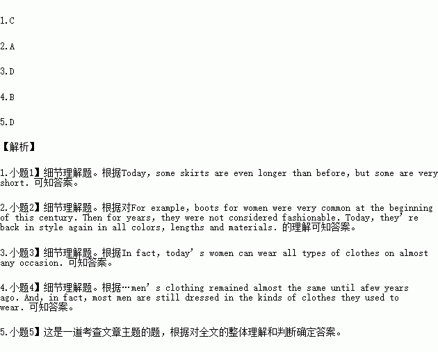 Women’s fashions change more rapidly than men’s.In the early 1990’s,all women wore their skirts to the ankle.Today,some skirts are even longer than before,but some are very short.Women’s shoes have also gone through all sorts of changes in the last 17 years.For example,boots for women were very common at the beginning of this century.Then for years,they were not considered fashionable.Today,they’re back in style again in all colors,lengths and materials.In fact,today’s women can wear all types of clothes on almost any occasion.While all of these changes were taking place in women’s fashions,men’s clothing remained almost the same until a few years ago.And,in fact,most men are still dressed in the kinds of clothes they used to wear.