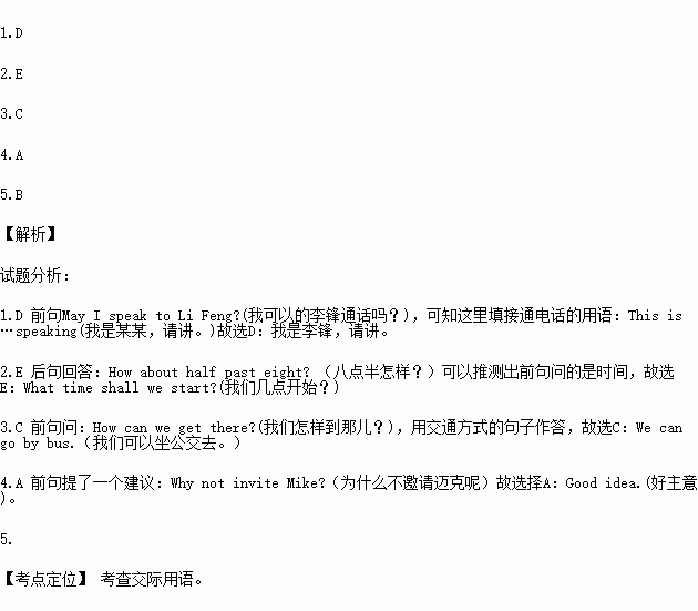 A.Good idea. B.See you then. C.We can go by bus. D.This is Li Feng speaking. E.What time shall we start. |