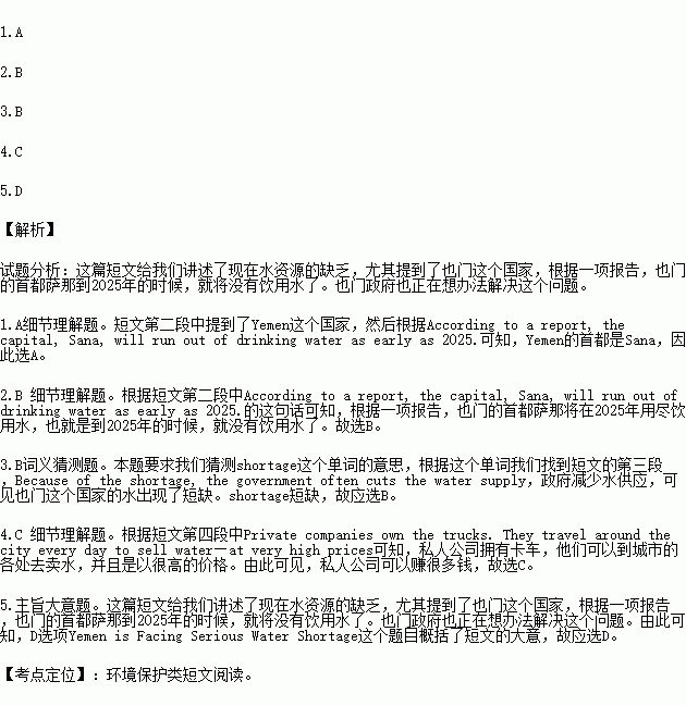 Because of the shortage, the government often cuts the water supply(供应). Hannan, an 18-year-old from Lahej, told Times: “In a good week we’ll have a water supply all week. But then the following week there will be water only for a day or two.”