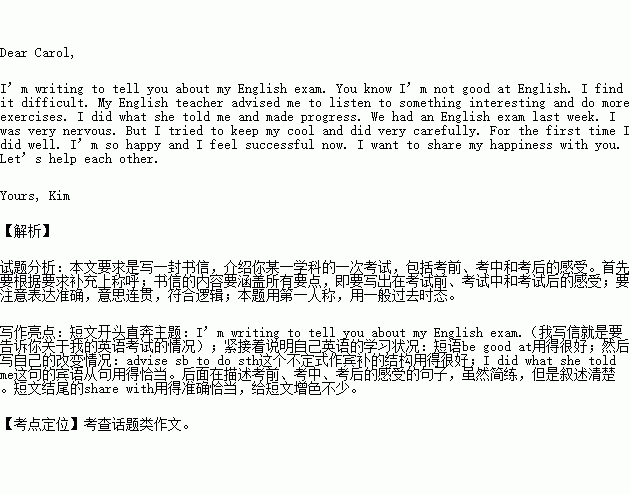 假如你是Kim,请给你最想交流的人写一封信,介绍你某一学科的一次考试,包括考前、考中和考后的感受。