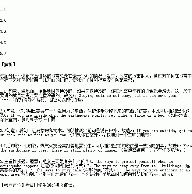 Stay calm as the earth begins to shake. Your chances of survival (幸存;存活) in an earthquake go up if you can keep calm.1.