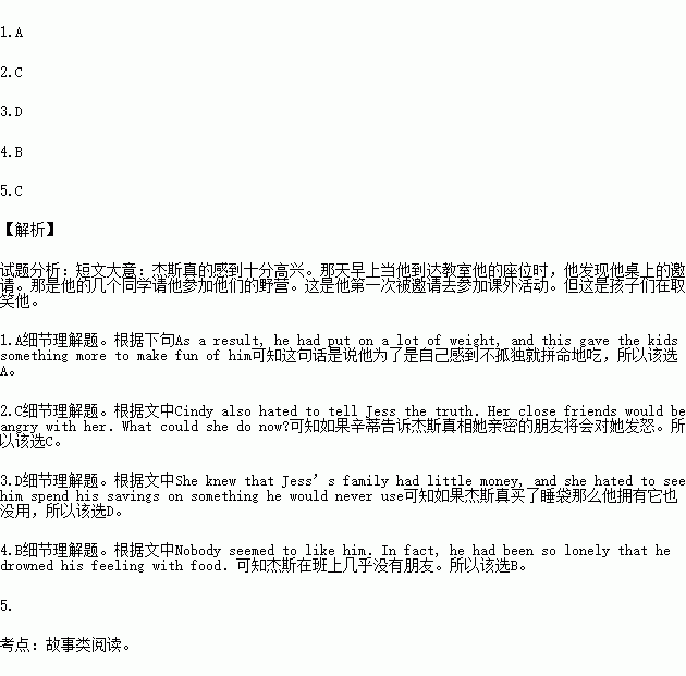 Jess really felt very happy.When he arrived at his seat in the classroom that morning, he found an invitation on his desk.It was from several of his classmates asking him to join them on a camping trip.This was the first time he was asked to join in an out-of-school activity.Why were they asking him now? Nobody seemed to like him.In fact, he had been so lonely that he drowned his feeling with food.As a result, he had put on a lot of weight, and this gave the kids something more to make fun of him.