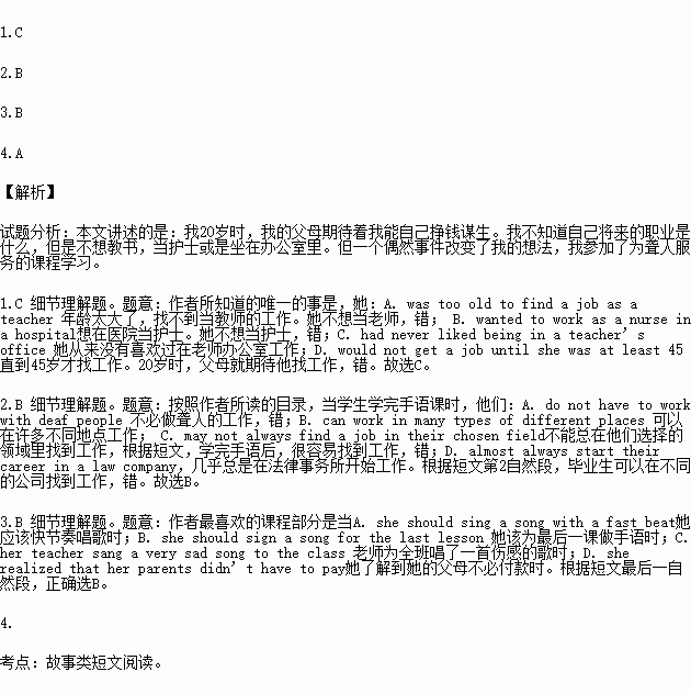 I was twenty years old, and my parents were looking forward to the day when I would be earning my own living. Unfortunately, I had absolutely no idea what I wanted my future occupation to be. The only thing I did know was that I did not want to spend the next 45 years teaching, being a nurse or sitting in an office. But that was before the postman delivered a catalogue (目录) of courses that were being offered at the local college. As I looked through it, I was attracted by a page that talked about the difficulties faced by deaf people in their everyday lives and how students could help by learning sign language. It went on to say that graduates of the course usually find work in different organizations, such as law companies, the Stock Exchange, insurance companies and banks. Then I saw something that really caught my eye: “Singer” are also needed for sporting events, concerts, theatrical performances and, believe it or not, circuses! By the time I got to the bottom of the page, I knew I had found the perfect occupation.