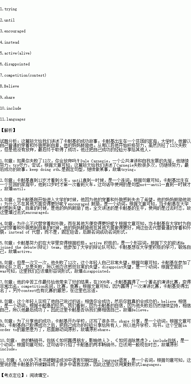 The young man made his own words come true: “B 8.that you will succeed, and you will.” In order to s 9. his success, Carnegie opened schools and wrote books. His best-sellers(畅销书) i 10.How to Win Friends and Influence People and How to Stop Worrying and Start Living. More than 50 million copies of his books have been printed in 38 l____________11.. They are still helping people on the road to success.