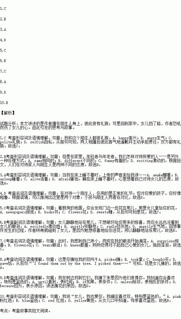 While l was in bed. God's small voice came to me and said, "When dealing with a ,common manners you use, but the children you love, you seem to be rude. Look on the kitchen floor, and you will find some there by the door. Those are the flowers your daughter brought for you. She picked them herself, pink, yellow and blue. Your daughter stood not to spoil(毁坏)the surprise, and you never saw the tears in her eyes."