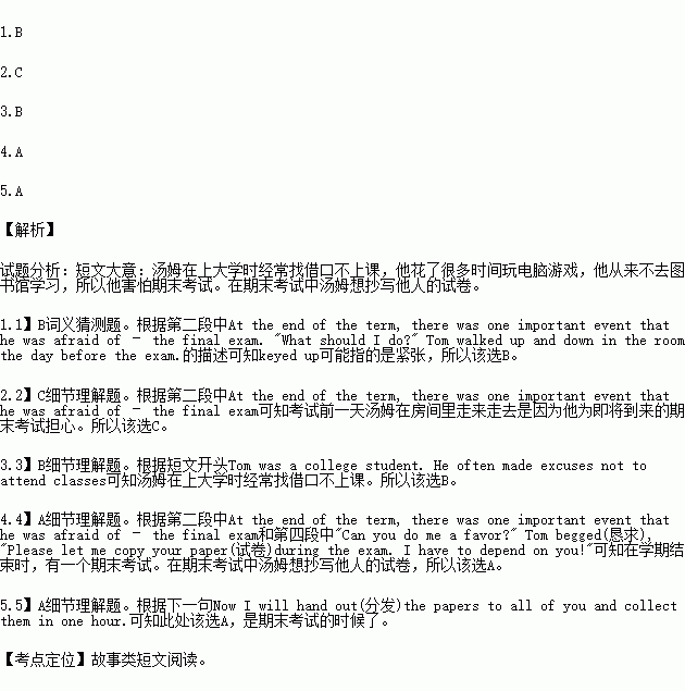 How time flew! At the end of the term, there was one important event that he was afraid of – the final exam. "What should I do?" Tom walked up and down in the room the day before the exam. He was keyed up. Suddenly, he thought of an idea.
