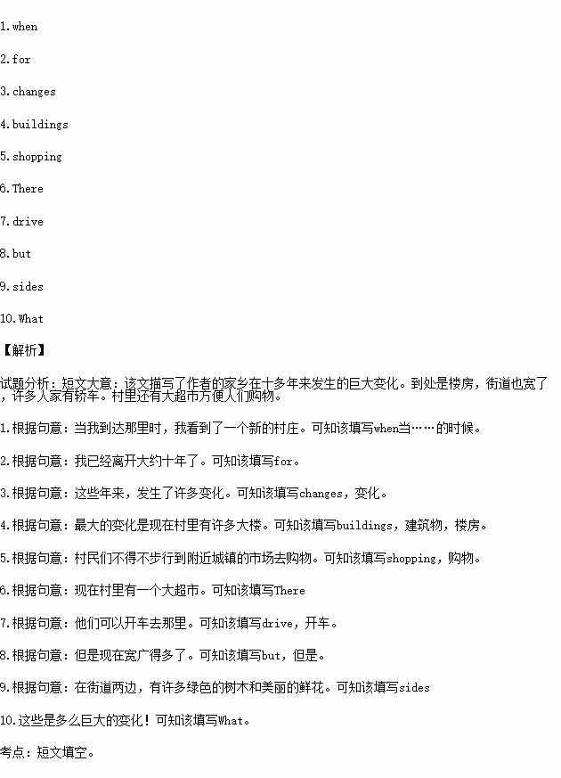 I have been away 2.____ about ten years. During these years, many 3. _____ have taken place. The greatest change is that there are many tall4. _____ in the village now. But in the past there weren’t any at all. Before I left the village, the villagers had to walk to the markets in nearby towns to go 5._____, but now they don’t have to. 6. _____ is a big supermarket in the village now. Many families have cars, so if they want to go to nearby towns, they can 7._____ their cars there. The streets in the village were not wide before,8._____ now they are much wider. On both9._____ of the streets, there are lots of green trees and beautiful flowers.