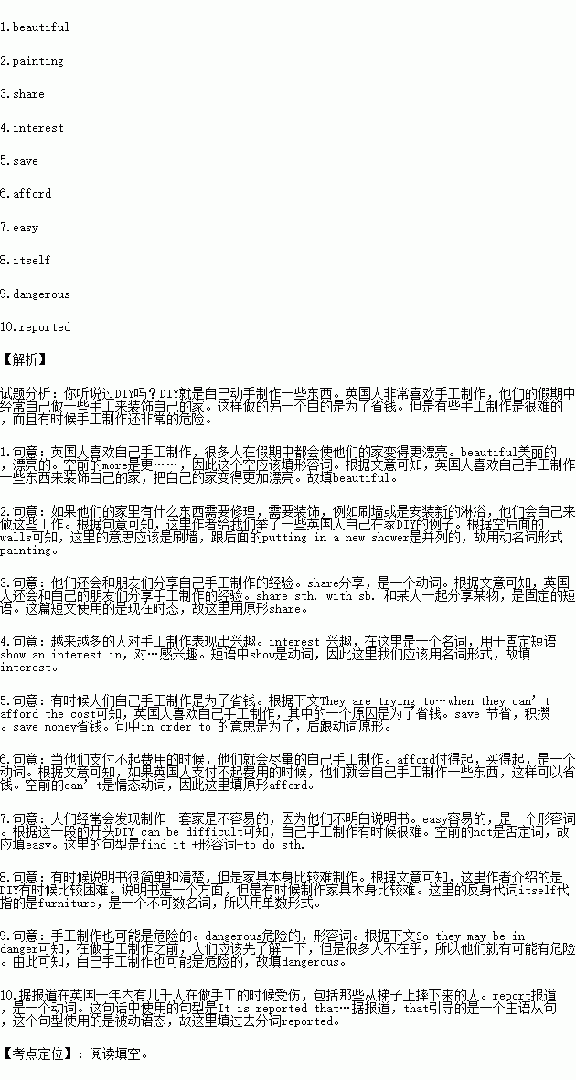 DIY can be difficult. People often find it not e 7. to build a piece of furniture because they can't understand the instructions well. Sometimes the instructions are simple and clear, but the furniture i 8. is difficult to build. DIY can also be d 9. . People should learn much about DIY work before doing it. Unluckily, many people don't care about that. So they may be in danger. It is r 10. that in just one year thousands of people were hurt while doing DIY in the UK, including those who fell off ladders.