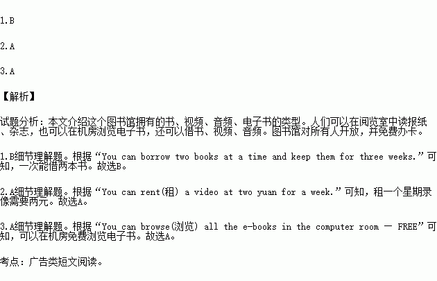 E-books | ● many different kinds of e-books ● e-newspapers and e-magazines You can browse(浏览) all the e-books in the computer room — FREE |