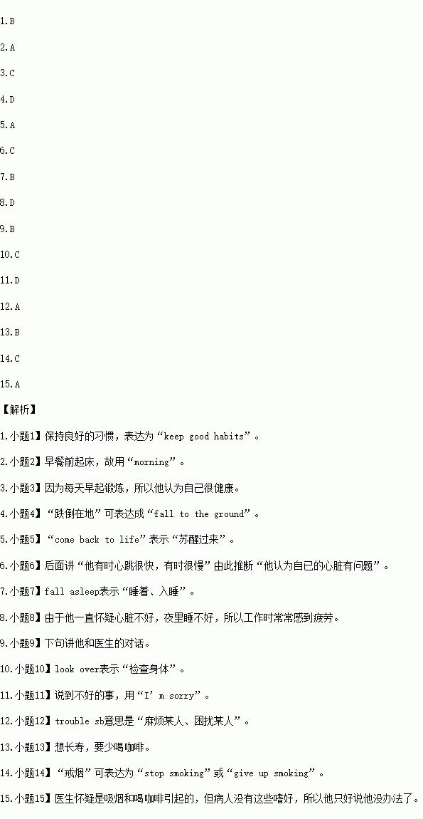 Mr.North looks worried this week.He always________good habits.He gets up early in the________and does some exercises before breakfast.He thought himself________and didn’t often go to see a doctor.But last Friday morning.when he was walking near the garden,he suddenly fell to the________.There was nobody around him and a few minutes later he came back to________.He stood up and went back slowly.He thinks something is wrong with his________and sometimes it beats fast,sometimes slows down.He can’t fall________in the evening.And he often feels________when he’s at work.