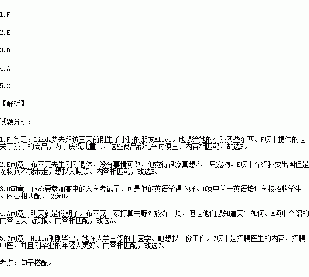 请仔细阅读第1-5小题中有关五个人的情况介绍,从A-F中选出相应的信息,其中一项为多余选项。