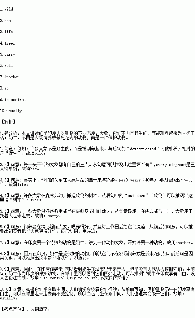 Animals are important in Indian culture and are treaded in a special way. For example, a lot of elephants aren’t 1. . they are domesticated(驯养). They aren’t kept as pets, but as working animals. Every working elephant 2. its own keeper. An elephant and its keep meet for the first time when they are both young, and they grow up together. In fact, their relationship continues for the rest of the elephant’s 3. perhaps 40 years. Lots of elephants work in the forest, moving heavy 4. when they are cut down. Some give rides to tourists, or 5. people during celebrations and festivals. Keepers take excellent care of their elephants , feeding them 6. and giving them a bath at the end of the working day.