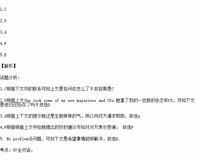 A.What should Ido? B.What were you doing? C.What’s wrong? D.Did she give them back to you? E.Hope things work out. F. Thanks for your advice. G. Are you angry? |