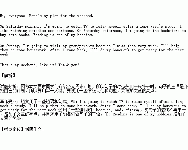 英语课上,老师要求同学们介绍个人周末计划。假设下面表格内容是你的计划提纲,请根据表格提示的活动内容,写一篇发言稿,介绍你的周末计划,并在班上与同学交流。