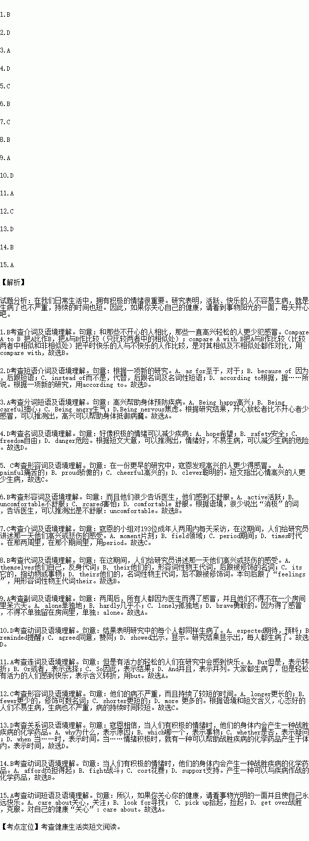 In this study, Cohen’s team interviewed 193 adults every day for two weeks. In this , the people told researchers about happy or sad feelings that day. Two weeks later, all of them were made to catch colds by doctors, and they had to stay in a room for six days.