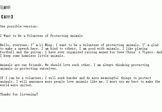 十月四日是世界动物日,你校组织以“I Want to Be a Volunteer of Protecting Animals”为题的英语演讲比赛。假如李明参加比赛,请你以李明的名义写一篇英语演讲稿推荐自己,内容如下: