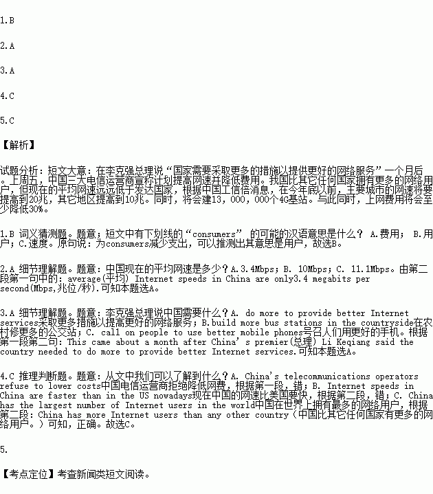 Last Friday, all three of China's telecommunications(电信运营商) operators announced plans to raise Internet speeds and lower costs for consumers. This came about a month after China’s premier(总理) Li Keqiang said the country needed to do more to provide better Internet services.