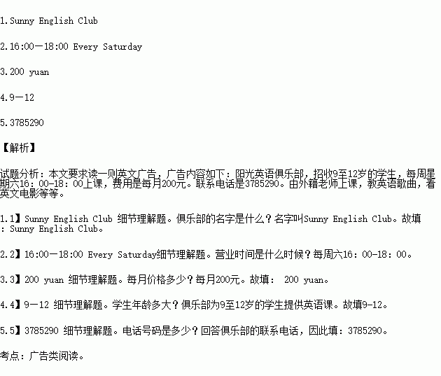Sunny English Club For students (9-12 years old) 16:00-18:00 Every Saturday 200 yuan a month 9 Zhou Yu Street Tel:3785290 Foreign teachers, English songs and films and more! |
